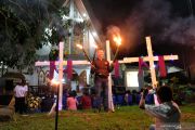 Sejumlah umat Kristiani menyelenggarakan pawai obor sebagai perayaan peristiwa Kebangkitan Yesus Kristus di Jalan Rijali, Karang Panjang, Ambon, Maluku, Minggu (21/04/2019). ANTARA FOTO/ Atika Fauziyyah/hp.