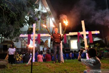 Umat Kristiani berswafoto dengan obor sebagai bentuk perayaan peristiwa Kebangkitan Yesus Kristus di GPM PNIEL Wayam, Ambon, Maluku, Minggu (21/04/2019). ANTARA FOTO/Atika Fauziyyah/hp.