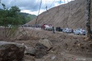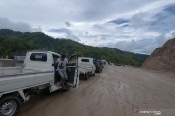 Sejumlah kendaraan berjalan dalam antrean akibat tanah longsor di jalur Trans Sulawesi Km 38, Kabupaten Parigi Moutong, Sulawesi Tengah, Minggu (21/4/2019). Tanah longsor yang kerap terjadi di jalur itu disebabkan tingginya curah hujan dan kontur tanah yang rentan serta berbukit. ANTARA FOTO/Basri Marzuki/wsj.