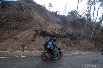 Pengendara motor melintas di jalan yang baru saja dibersihkan dari material tanah longsor di jalur Trans Sulawesi Km 38, Kabupaten Parigi Moutong, Sulawesi Tengah, Minggu (21/4/2019). Tanah longsor yang kerap terjadi di jalur itu disebabkan tingginya curah hujan dan kontur tanah yang rentan serta berbukit. ANTARA FOTO/Basri Marzuki/wsj.