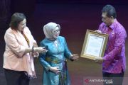 Ketua Umum Dewan Kerajinan Nasional (Dekranas) Mufidah Jusuf Kalla (kedua kiri) dan President World Craft Council (WCC) Asia Pasific Region Ghada Hijjawi Qaddumi (kiri) menyerahkan sertifikat World Craft City kepada Wakil Bupati Gianyar AA Gde Mayun (kedua kanan) disaksikan Ketua Dekranasda Gianyar Ida Ayu Surya Adnyani Mahayastra (kanan) di Gianyar, Bali, Senin (22/4/2019). Kabupaten Gianyar berhasil menerima sertifikat dan dinobatkan sebagai Kota Kerajinan Dunia oleh World Craft Council. ANTARA FOTO/Fikri Yusuf/hp.