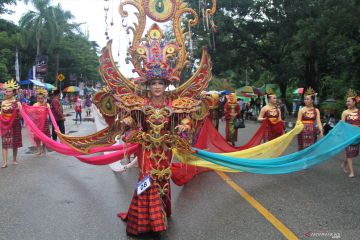 Peserta festival dari Suku Tolaki Konawe Selatan menunjukan kain tenun khas mereka saat Festival Tenun dan Atraksi Budaya Daerah Sulawesi Tenggara, Kendari, Sulawesi Tenggara, Rabu (24/4/2019). Festival tenunan khas dan atraksi budaya tradisional dari 17 kabupaten di Sulawesi Tenggara bertujuan melestarikan kearifan lokal serta ajang promosi daerah. ANTARA FOTO/Jojon/hp.