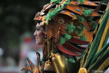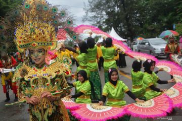 Peserta festival dari Suku Tolaki Konawe Selatan menunjukan tarian kipas dan mengenakan kain tenunan khas mereka saat Festival Tenun dan Atraksi Budaya Daerah Sulawesi Tenggara, Kendari, Sulawesi Tenggara, Rabu (24/4/2019). Festival tenunan khas dan atraksi budaya tradisional dari 17 kabupaten di Sulawesi Tenggara bertujuan melestarikan kearifan lokal serta ajang promosi daerah. ANTARA FOTO/Jojon/hp.