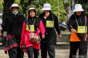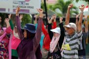 Sejumlah Calon Jamaah Haji (CJH) mengikuti tes kebugaran jasmani mengelilingi lapangan Hiraq Lhokseumawe, Aceh, Kamis (25/4/2019). Tes kebugaran dengan metode tes jalan Rockport itu merupakan elemen mendasar untuk ketahanan dan kekuatan fisik guna meningkatkan kinerja jantung, paru-paru dan otot bagi 280 CJH kota Lhokseumawe yang akan diberangkatkan pada musim haji gelombang kedua pada 20 Juli 2019. ANTARA FOTO/Rahmad/pras.