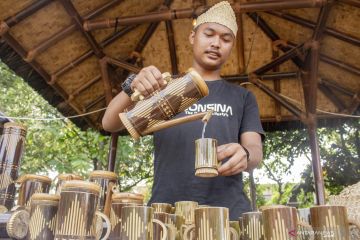 Perajin mencoba menuangkan air dari teko bambu ke dalam gelas bambu saat mengikuti Festival Bambu Kreatif di Taman Pesanggrahan Padjadjaran, Purwakarta, Jawa Barat, Minggu (28/4/2019). Festival tersebut menyajikan hasil kreatifitas perajin bambu untuk mengenalkan seni kreatif bambu dengan harapan dapat meningkatkan daya tarik wisatawan lokal dan mancanegara. ANTARA FOTO/M Ibnu Chazar/hp.