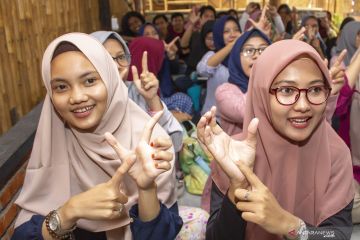 Sejumlah peserta mempraktekkan Bahasa Isyarat Indonesia (Bisindo) saat mengikuti kegiatan belajar bahasa isyarat bersama Gerakan untuk Kesejahteraan Tunarungu Indonesia (Gerkatin) Karawang di Kedai Patroli Kopi 3, Karawang, Jawa Barat, Selasa (30/4/2019). Kegiatan tersebut bertujuan untuk mengedukasi dan mensosialisasi bahasa isyarat kepada masyarakat dan generasi muda sebagai bentuk pemberian hak berkomunikasi untuk penyandang tunarungu. ANTARA FOTO/M Ibnu Chazar/foc.