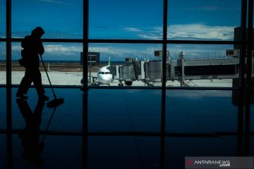 Petugas kebersihan bekerja dengan latar belakang pesawat komersial maskapai Citilink terparkir di Yogyakarta International Airport (YIA) saat "Proving Flight" di Kulon Progo, DI Yogyakarta, Kamis (2/5/2019). Uji coba perdana pesawat komersial dengan rute penerbangan CKG-YIA-CKG tersebut menjadi salah satu bagian persiapan operasional YIA. ANTARA FOTO/Andreas Fitri Atmoko/pras.
