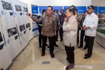 Wakil Presiden Jusuf Kalla (tengah) didampingi Menteri Perhubungan Budi Karya Sumadi (kanan) dan Direktur Utama Angkasa Pura I Faik Fahmi (kiri) melihat foto dokumentasi pembangunan Bandara Internasional Yogyakarta (YIA) di Kulonprogo, DI Yogyakarta, Sabtu (4/5/2019). Wapres berkunjung ke YIA untuk melihat secara langsung kesiapan sarana dan prasarana bandara yang rencananya akan mulai beroperasi pada Senin 6 Mei 2019. ANTARA FOTO/Andreas Fitri Atmoko/pras.