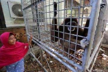 Seorang anak melihat owa sumatra (Hylobates agilis) yang sedang dalam proses rehabilitasi sebelum dilepasliarkan di kandang Balai Konservasi Sumber Daya Alam (BKSDA), Banda Aceh, Aceh, Selasa (14/5/2019). Indonesia memiliki tujuh jenis owa dari 19 jenis di kawasan Asia yang keberadaannya semakin terancam punah akibat perburuan dan kerusakan hutan. ANTARA FOTO/Irwansyah Putra/hp.