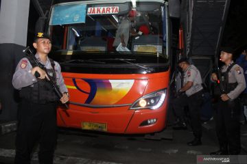 Anggota Brimob Polri bersenjata lengkap dan sabhara polresta Sidoarjo berpatroli di Terminal Purabaya (Bungurasih) Sidoarjo, Jawa Timur, Sabtu (18/5/2019). Polda Jawa Timur memperketat penjagaan di terminal Bungurasih untuk mengantisipasi keberangkatan ke Jakarta terkait pengumuman hasil pemilihan presiden pada 22 Mei 2019 di KPU RI, Jakarta. ANTARA FOTO/Umarul Faruq/hp.