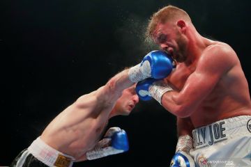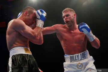 Petinju asal Inggris Billy Joe Saunders (kiri) melancarkan pukulan ke arah lawannya petinju asal Serbia Shefat Isufi dalam duel tinju WBO World Super kelas middleweight di The Lamex Stadium, Stevenage, Inggris, Minggu (19/5/2019) dini hari. Billy Joe Saunders memenangkan gelar super-menengah kelas dunia WBO yang kosong dengan kemenangan poin penuh atas Shefat Isufi. ANTARA FOTO/Action Images via Reuters/Andrew Couldridge/wsj.