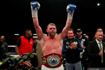 Petinju asal Inggris Billy Joe Saunders mengangkat kedua tangannya usai menang melawan petinju asal Serbia Shefat Isufi dalam duel tinju WBO World Super kelas middleweight di The Lamex Stadium, Stevenage, Inggris, Minggu (19/5/2019) dini hari. Billy Joe Saunders memenangkan gelar super-menengah kelas dunia WBO yang kosong dengan kemenangan poin penuh atas Shefat Isufi. ANTARA FOTO/Action Images via Reuters/Andrew Couldridge/wsj.