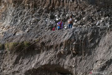 Warga melintasi tebing gunung dengan berjalan kaki akibat jalan utama Trans Palu-Kulawi terputus diterjang banjir di Desa Salua, Kecamatan Gumbasa, Sigi, Sulawesi Tengah, Minggu (19/5/2019). Akibat banjir yang terjadi pada Jumat (17/5/2019) akses jalan itu putus dan empat kecamatan di kabupaten itu terisolasi sementara warga memaksakan diri melewati tebing yang hanya dapat dilalui dengan sepeda motor. ANTARA FOTO/Basri Marzuki/foc.