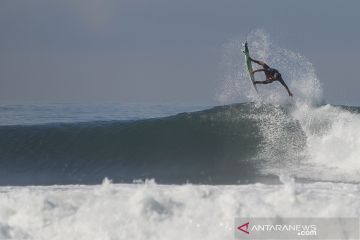 Peselancar asal Brazil Michael Rodrigues beraksi saat babak 16 besar kategori pria kejuaraan selancar dunia "Corona Bali Protected" di Pantai Keramas, Gianyar, Bali, Senin (20/5/2019). Michael Rodrigues lolos ke babak perempat final kejuaraan yang merupakan seri ketiga Liga Selancar Dunia atau World Surf League (WSL) Champions Tour 2019 tersebut usai mengalahkan peselancar asal Australia Julian Wilson. ANTARA FOTO/Fikri Yusuf/hp.
