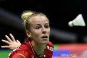 Pebulu tangkis tunggal putri Denmark Mia Blichfeldt mengembalikan kok ke arah pebulu tangkis Inggris Chloe Birch pada penyisihan grup 1B Piala Sudirman di Guangxi Sports Center Gymnasium, Nanning, China, Senin (20/5/2019). Denmark akan bertanding melawan Indonesia pada Rabu (22/5/2019). ANTARA FOTO/Wahyu Putro A/hp.