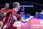 Pebulu tangkis ganda putra Denmark Kim Astrup (kanan) dan Anders Skaarup Rasmussen (kiri) mengembalikan kok ke arah pebulu tangkis Inggris Marcus Ellis dan Chris Langridge pada penyisihan grup 1B Piala Sudirman di Guangxi Sports Center Gymnasium, Nanning, China, Senin (20/5/2019). Denmark akan bertanding melawan Indonesia pada Rabu (22/5/2019). ANTARA FOTO/Wahyu Putro A/hp.