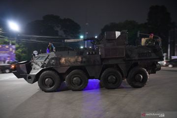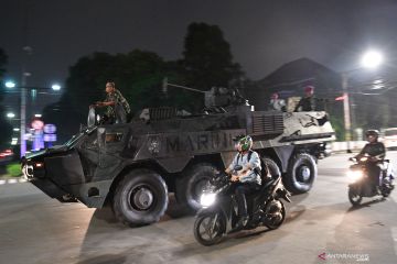 Prajurit Marinir mengendarai kendaraan taktis dan tempur melintas di dekat kantor KPU, Jakarta, Senin (20/5/2019). Prajurit TNI dari berbagai kesatuan akan disebar ke sejumlah titik dan objek vital di Jakarta guna membantu pengamanan Ibu Kota jelang pengumuman hasil Pemilu serentak 2019 oleh KPU. ANTARA FOTO/Sigid Kurniawan/WSJ.