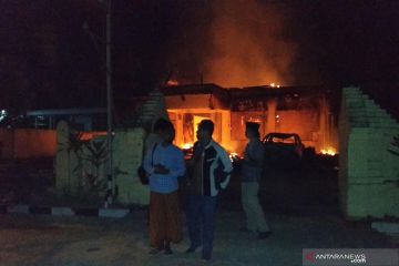 Suasana Polsek Tambelangan yang dibakar massa, Sampang, Jawa Timur, Rabu (22/5/2019). Massa yang belum diketahui identitasnya itu membakar kantor Polsek dan sebuah mobil patroli. ANTARA FOTO/Rusyidi Zain/pras/pri