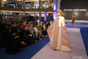 Model membawakan busana rancangan kolaborasi Gita Orlin dan Sarung Mangga saat peragaan busana bertajuk Blissful Ramadhan di Surabaya, Jawa Timur, Sabtu (25/5/2019). Peragaan busana yang digelar Asosiasi Perancang Pengusaha Mode Indonesia (APPMI) Jawa Timur tersebut bertujuan untuk memperkenalkan sekaligus memasarkan produk-produk busana muslim para desainer kepada masyarakat sebagai pilihan dalam menyambut bulan Ramadhan dan Idul Fitri 1440 H. ANTARA FOTO/Moch Asim/hp.