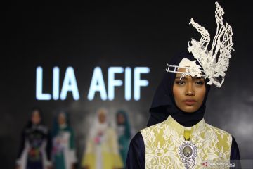 Model membawakan busana rancangan Lia Afif saat peragaan busana bertajuk Blissful Ramadhan di Surabaya, Jawa Timur, Sabtu (25/5/2019). Peragaan busana yang digelar Asosiasi Perancang Pengusaha Mode Indonesia (APPMI) Jawa Timur tersebut bertujuan untuk memperkenalkan sekaligus memasarkan produk-produk busana muslim para desainer kepada masyarakat sebagai pilihan dalam menyambut bulan Ramadhan dan Idul Fitri 1440 H. ANTARA FOTO/Moch Asim/hp.