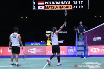 Ekspresi pebulu tangkis ganda putri Indonesia Greysia Polii (kanan) dan Apriyani Rahayu melakukan protes kepada wasit ketika bertanding dengan ganda putri Jepang Mayu Matsumoto/Wakana Nagahara pada babak semi final Piala Sudirman 2019 di Guangxi Sports Center Gymnasium, Nanning, China, Sabtu (25/5/2019). Apriyani/Greysia kalah 0-2 (15-21 dan 17-21) dari Mayu Matsumoto/Wakana Nagahara dan akhirnya Indonesia gagal melaju ke final Piala Sudirman 2019 setelah kalah 1-3 dari Jepang. ANTARA FOTO/Wahyu Putro A/hp.A
