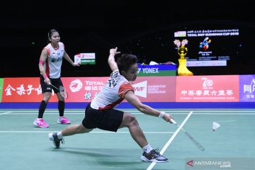 Pebulu tangkis ganda putri Indonesia Apriyani Rahayu (kanan) dan Greysia Polii mengembalikan kok ke arah ganda Jepang Mayu Matsumoto/Wakana Nagahara pada babak semi final Piala Sudirman 2019 di Guangxi Sports Center Gymnasium, Nanning, China, Sabtu (25/5/2019). Apriyani/Greysia kalah 0-2 (15-21 dan 17-21) dari Mayu Matsumoto/Wakana Nagahara dan akhirnya Indonesia gagal melaju ke final Piala Sudirman 2019 setelah kalah 1-3 dari Jepang. ANTARA FOTO/Wahyu Putro A/hp.