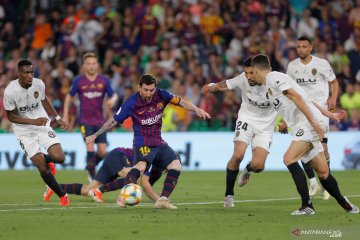 Pespek bola Barcelona Lionel Messi (tengah) berebut bola dengan pesepak bola Valencia Ezequiel Garay dalam laga final Copa Del Rey, di Stadion Estadio Benito Villamarin, Sevilla, Spanyol, Sabtu (25/5/2019). Valencia menjuarai Copa Del Rey setelah mengalahkan Barcelona di babak final 2-1. ANTARA FOTO/Reuter-Jon Nazca/hp.