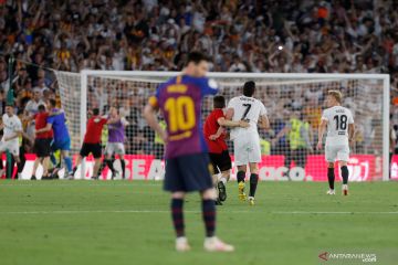 Pesepak bola Barcelona Lionel Messi terlihat kecewa sementara pesepak bola Valencia Goncalo Guedes dan rekan satu timnya melakukan selebrasi dalam laga final Copa Del Rey, di Stadion Estadio Benito Villamarin, Sevilla, Spanyol, Sabtu (25/5/2019). Valencia menjuarai Copa Del Rey setelah mengalahkan Barcelona di babak final 2-1. ANTARA FOTO/Reuter-Marcelo del Pozo/hp.