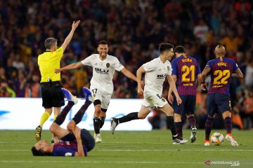 Pesepak bola Valencia Ezequiel Garay (tengah) melakukan selebrasi setelah tim nya mengalahkan Barcelona dalam laga final Copa Del Rey, di Stadion Estadio Benito Villamarin, Sevilla, Spanyol, Sabtu (25/5/2019). Valencia menjuarai Copa Del Rey setelah mengalahkan Barcelona 2-1. ANTARA FOTO/Reuter-Marcelo del Pozo/hp.