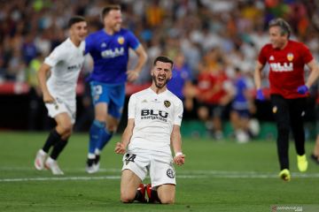 Pespak bola Valencia Francis Coquelin (kedua kiri) melakukan selebrasi saat timnya berhasil menjuarai Copa del Rey usai mengalahkan Barcelona di babak final, di Stadion Estadio Benito Villamarin, Sevilla, Spanyol, Sabtu (25/5/2019). Valencia mengalahkan Barcelona di babak final Copa Del Rey 2-1. ANTARA FOTO/Reuter-Marcelo del Pozo/hp.