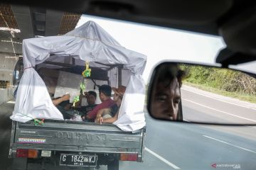 Pemudik berada di dalam mobil bak terbuka di Jalur Tol Cikarang Barat, Jawa Barat, Kamis (30/5/2019). Meski pihak kepolisian melarang penggunaaan kendaraan bak terbuka untuk mudik, tapi masih banyak pemudik yang melakukan hal tersebut. ANTARA FOTO/Rivan Awal Lingga/pras.