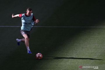 Pemain Liverpool Andrew Robertson dalam sesi latihan di Madrid, Spanyol, Jumat (31/5/2019). ANTARA FOTO/REUTERS/Carl Recine/ foc.