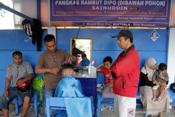 Tukang cukur memangkas rambut pelanggannya di Kecamatan Bontoala, Makassar, Sulawesi Selatan, Sabtu (1/6/2019). Jelang Idul Fitri 1440 H, permintaan jasa pangkas rambut dengan tarif Rp20 ribu per kepala di daerah itu meningkat dua kali lipat dari biasanya. ANTARA FOTO/Arnas Padda/YU/ama.