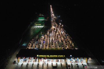 Kendaraan pemudik antre memasuki Gerbang Tol Cikampek Utama, Cikampek, Jawa Barat, Sabtu (1/6/2019). ANTARA FOTO/Rivan Awal Lingga/hp/pri
