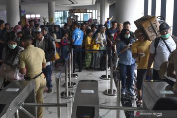 Pemudik tujuan Sumatra antre memasuki kapal Roro di Dermaga Eksekutif Sosoro Pelabuhan Merak, Banten, Minggu (2/6/2019). ANTARA FOTO/Hafidz Mubarak A/hp/pri