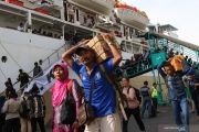Penumpang turun dari kapal KM Kelimutu yang bersandar di Dermaga Jamrud Utara, Pelabuhan Tanjung Perak, Surabaya, Jawa Timur, Minggu (2/6/2019). Sekitar 1.500 pemudik turun dari kapal laut yang bertolak dari Sampit itu. ANTARA FOTO/Didik Suhartono/aww.