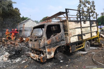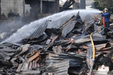 Petugas pemadam kebakaran melakukan pendinginan usai terjadinya kebakaran di Pasar Minggu, Jakarta, Sabtu (8/6/2019). Kebakaran yang menghanguskan 21 tempat tinggal berupa rumah kontrakan dan lapak pemulung serta sejumlah kendaraan itu diduga terjadi akibat hubungan pendek (korsleting) listrik. ANTARA FOTO/Akbar Nugroho Gumay/foc.