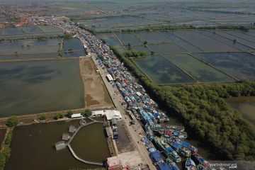 Kapal nelayan terparkir saat tidak melaut di muara sungai Prajagumiwang, Karangsong, Indramayu, Jawa Barat, inggu (9/6/2019). Nelayan daerah tersebut mulai kembali melaut usai merayakan Lebaran. ANTARA FOTO/Dedhez Anggara/hp.