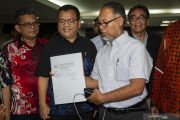 Ketua Tim Hukum Prabowo-Sandi, Bambang Widjojanto (kedua kanan) menunjukkan berkas tanda terima pengajuan perbaikan permohonan sengketa hasil Pilpres 2019 di gedung MK, Jakarta, Senin (10/6/2019). Tim kuasa hukum Prabowo-Sandi menyerahkan perbaikan permohonan sengketa hasil Pilpres 2019 serta dokumen-dokumen yang diperlukan diantaranya C1 serta bukti-bukti lainnya. ANTARA FOTO/Dhemas Reviyanto/hp.