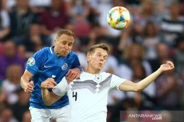 Pemain Jerman Thilo Kehrer berebut bola dengan pemain Estonia Sander Puri dalam laga lanjutan kualifikasi Piala Eropa 2020 Grup C di Opel Arena, Mainz, Rabu (12/6/2019) dini hari. Jerman cukur Estonia 8-0. ANTARA FOTO/REUTERS/Ralph Orlowski/pras.
