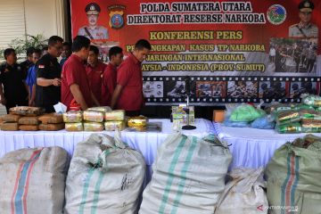 Polisi menggiring sejumlah tersangka bandar narkoba dengan barang bukti narkotika jenis sabu, ekstasi dan ganja saat gelar kasus pengungkapan kasus narkoba jaringan internasional di Mapolda Sumut, Medan, Sumatera Utara, Kamis (13/6/2019). Polda Sumut berhasil mengamankan 15 orang tersangka bandar narkotika jaringan internasional Malaysia-Indonesia dengan barang bukti 50 kilogram sabu, 170 kilogram ganja dan 15.846 butir pil ekstasi. ANTARA FOTO/Septianda Perdana/wsj.