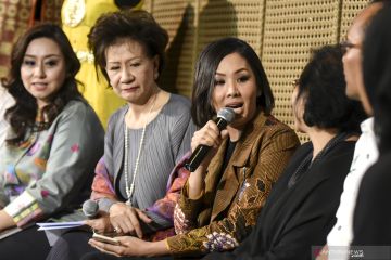 Program Director Bakti Budaya Djarum Foundation Renitasari Adrian (ketiga kanan) bersama Presiden Direktur Ciputra Artpreneur Rina Ciputra Sastrawinata (kedua kiri), Vice Chairwoman Martha Tilaar Group Wulan Tilaar (kiri) memberikan keterangan pers jelang pertunjukan karya musik-teater kelas dunia I La Galigo di Galeri Indonesia Kaya, Jakarta, Kamis (13/6/2019). I La Galigo merupakan pertunjukan musik teater yang terinfiprasi dari wiracarita mitos penciptaan suku bugis tersebut akan berlangsung di Ciputra Artpreneur Theater pada 3, 5, 6 dan 7 Juli 2019. ANTARA FOTO/Muhammad Adimaja/wsj.