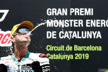 Pembalap tim Leopard Racing Marcos Ramirez merayakan kemenangannya seusai perlombaan kelas Moto3 Catalunya Grand Prix di Circuit de Barcelona-Catalunya, Barcelona, Spanyol, Minggu (16/6/2019). ANTARA FOTO/REUTERS/Albert Gea/aww