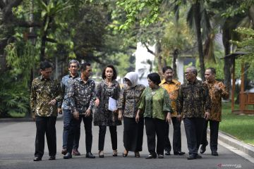Ketua Panitia Seleksi calon pimpinan Komisi Pemberantasan Korupsi (KPK) periode 2019-2023 Yenti Ganarsih (keempat kiri) bersama Wakil Ketua Pansel KPK Indriyanto Seno Adji (kanan), anggota Pansel KPK Marcus Priyo Gunarto (kedua kanan), Hendardi (ketiga kanan), Harkristuti Harkrisnowo (keempat kanan), Diani Sadia Wati (kelima kanan), Al Araf (ketiga kiri), Hamdi Moeloek (kedua kiri) dan Mualimin Abdi (kiri) usai bertemu Presiden Joko Widodo di Istana Kepresidenan, Jakarta, Senin (17/6/19). Presiden berharap Pansel KPK menghasilkan calon pimpinan KPK dengan kemampuan managerial dan menguasai dinamika pemberantasan korupsi. ANTARA FOTO/Puspa Perwitasari/pras.