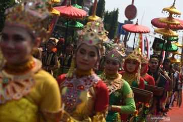 Iringan-iringan peserta Kirab Budaya Banjaran Mojobangkit di Kota Mojokerto, Jawa Timur, Kamis (27/6/2019). Kirab yang menampilkan sejumlah budaya kesenian Jawa Timur dan mengangkat tema Spirit of Majapahit tersebut dalam rangka memperingati Hari Jadi ke 101 Kota Mojokerto. ANTARA FOTO/Zabur Karuru/hp.