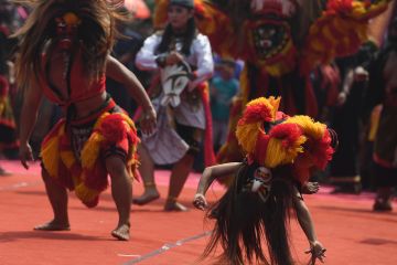 Sejumlah penari menampilkan tari kreasi saat Kirab Budaya Banjaran Mojobangkit di Kota Mojokerto, Jawa Timur, Kamis (27/6/2019). Kirab yang menampilkan sejumlah budaya kesenian Jawa Timur dan mengangkat tema Spirit of Majapahit tersebut dalam rangka memperingati Hari Jadi ke 101 Kota Mojokerto. ANTARA FOTO/Zabur Karuru/hp.