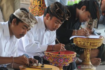Pelajar mengikuti Lomba Seni Lukis Prasi yang merupakan bentuk seni lukis di atas daun lontar saat Pesta Kesenian Bali 2019 di Denpasar, Bali, Minggu (30/6/2019). Lomba lukis prasi tersebut digelar sebagai upaya eksistensi sekaligus untuk melestarikan salah satu bentuk seni rupa tradisional Bali.. ANTARA FOTO/Fikri Yusuf/hp.