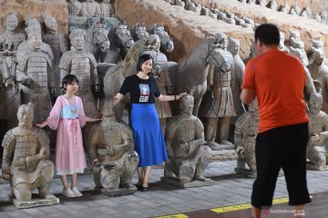 Pengunjung berfoto di samping patung prajurit di Museum Prajurit Terakota di Xi'an, Shaanxi, China, Jumat (5/7/2019). Pada hari libur, kunjungan wisatawan ke lokasi tersebut mencapai sedikitnya 90 ribu pengunjung tiap harinya dan rencananya akan ada pembatasan jumlah kunjungan ke objek wisata itu. ANTARA FOTO/Zabur Karuru/foc.