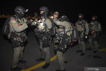 Prajurit Batalyon Intai Amfibi 2 Marinir (Yontaifib 2 Mar) TNI AL yang tergabung dalam Tim Terjun Tempur Latihan Armada Jaya XXXVII diperiksa kelengkapannya sebelum memasuki pesawat Casa NC 212 U-6205 Skuadron 600 Wing Udara 1 Puspenerbal Surabaya, Jawa Timur. Rabu (10/7/2019). Terjun tempur merupakan salah satu kemampuan yang dimiliki oleh prajurit Yontaifib 2 Mar sebagai pasukan khusus Korps Marinir TNI AL, yang digunakan sebagai sarana infiltrasi ke daerah sasaran musuh melalui media udara. ANTARA FOTO/Serka Mar Kuwadi/hp.