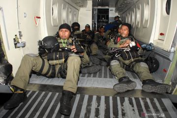 Prajurit Batalyon Intai Amfibi 2 Marinir (Yontaifib 2 Mar) TNI AL yang tergabung dalam Tim Terjun Tempur Latihan Armada Jaya XXXVII melakukan terjun dari pesawat Casa NC 212 U-6205 Skuadron 600 Wing Udara 1 Puspenerbal Surabaya, Jawa Timur. Rabu (10/7/2019). Terjun tempur merupakan salah satu kemampuan yang dimiliki oleh prajurit Yontaifib 2 Mar sebagai pasukan khusus Korps Marinir TNI AL, yang digunakan sebagai sarana infiltrasi ke daerah sasaran musuh melalui media udara. ANTARA FOTO/Serka Mar Kuwadi/hp.